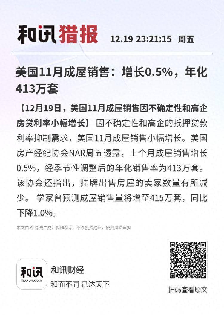【12月19日,美国11月成屋销售因不确定性和高企房贷利率小幅增长】因不确定性和高企的抵押贷款利率抑制需求,美国11月成屋销售小幅增长。美国房产经纪协会NAR周五透露,上个月成屋销售增长0.5%,经季节性调整后的年化销售率为413万套。该协会还指出,挂牌出售房屋的卖家数量有所减少。 学家曾预测成屋销售量将增至415万套,同比下降1.0%。