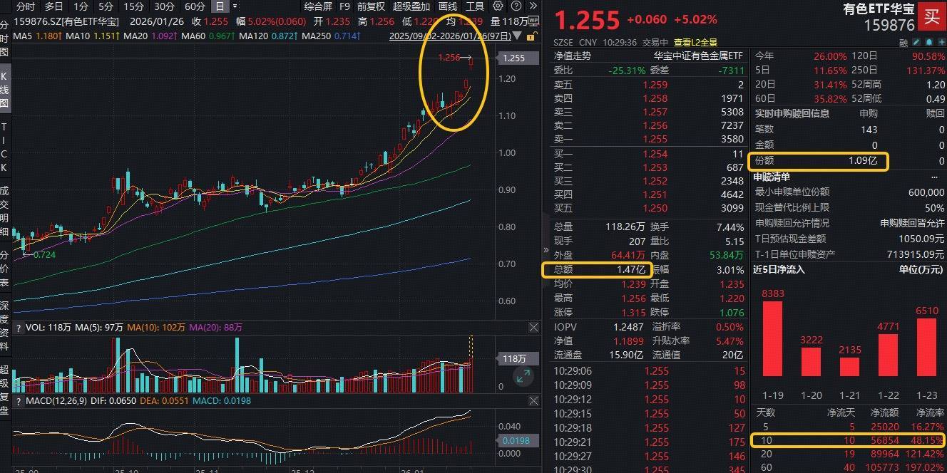 今日(1月26日)有色金属板块逆市领涨全行业,板块热门ETF——有色ETF华宝(159876)场内价格盘中飙涨5.02%,刷新上市以来的高点,实时成交额1.42亿元,开盘不足一小时,当前成交额已超前一交易日全天成交额。