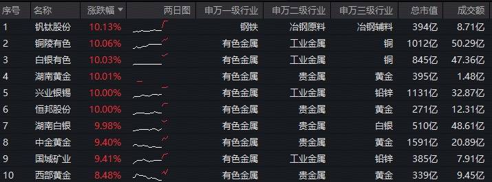 成份股方面,钒钛股份、铜陵有色、白银有色、湖南黄金、兴业银锡、恒邦股份、湖南白银7股涨停,中金黄金、国城矿业、西部黄金等个股大幅跟涨。权重股方面,山东黄金、洛阳钼业涨超7%,紫金矿业涨逾6%。