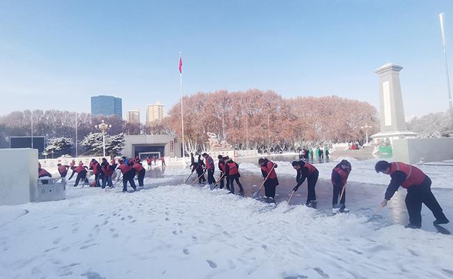 青年志愿者在华北军区烈士陵园清理冰雪。共青团河北省委供图