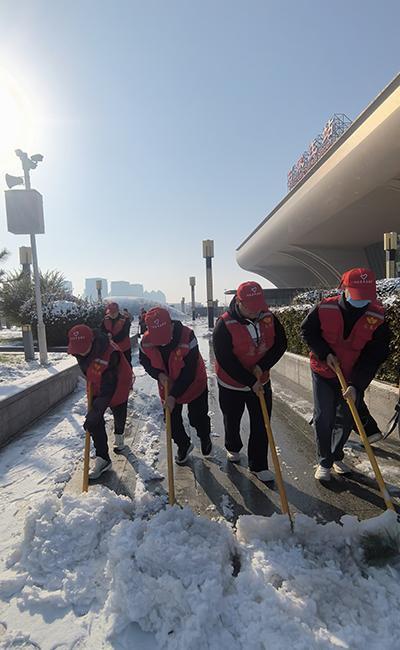 青年志愿者在石家庄站前广场清理冰雪。共青团河北省委供图