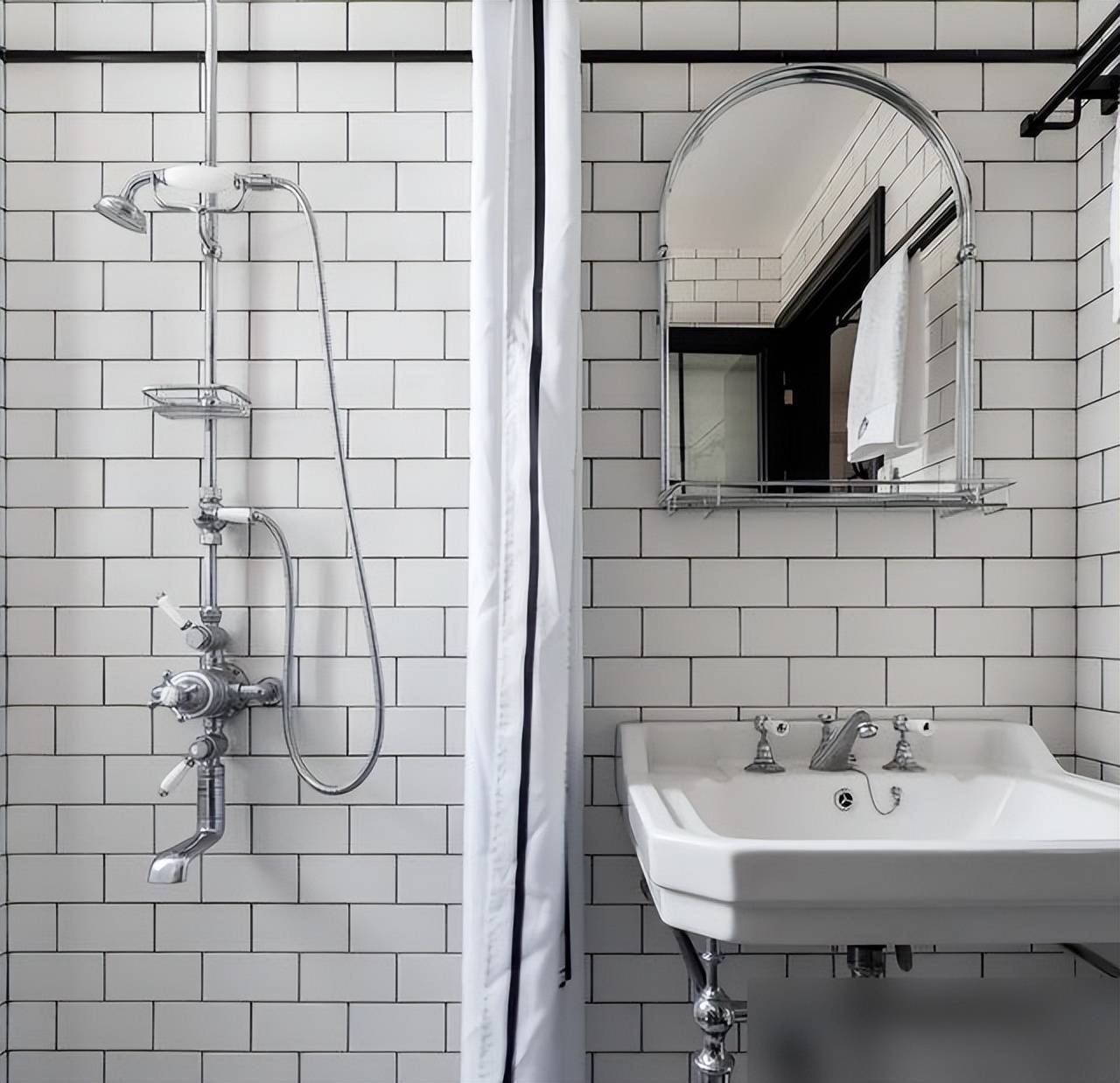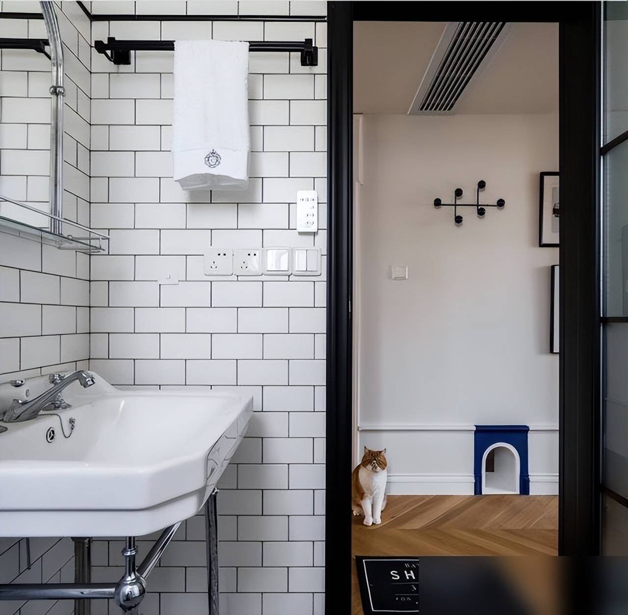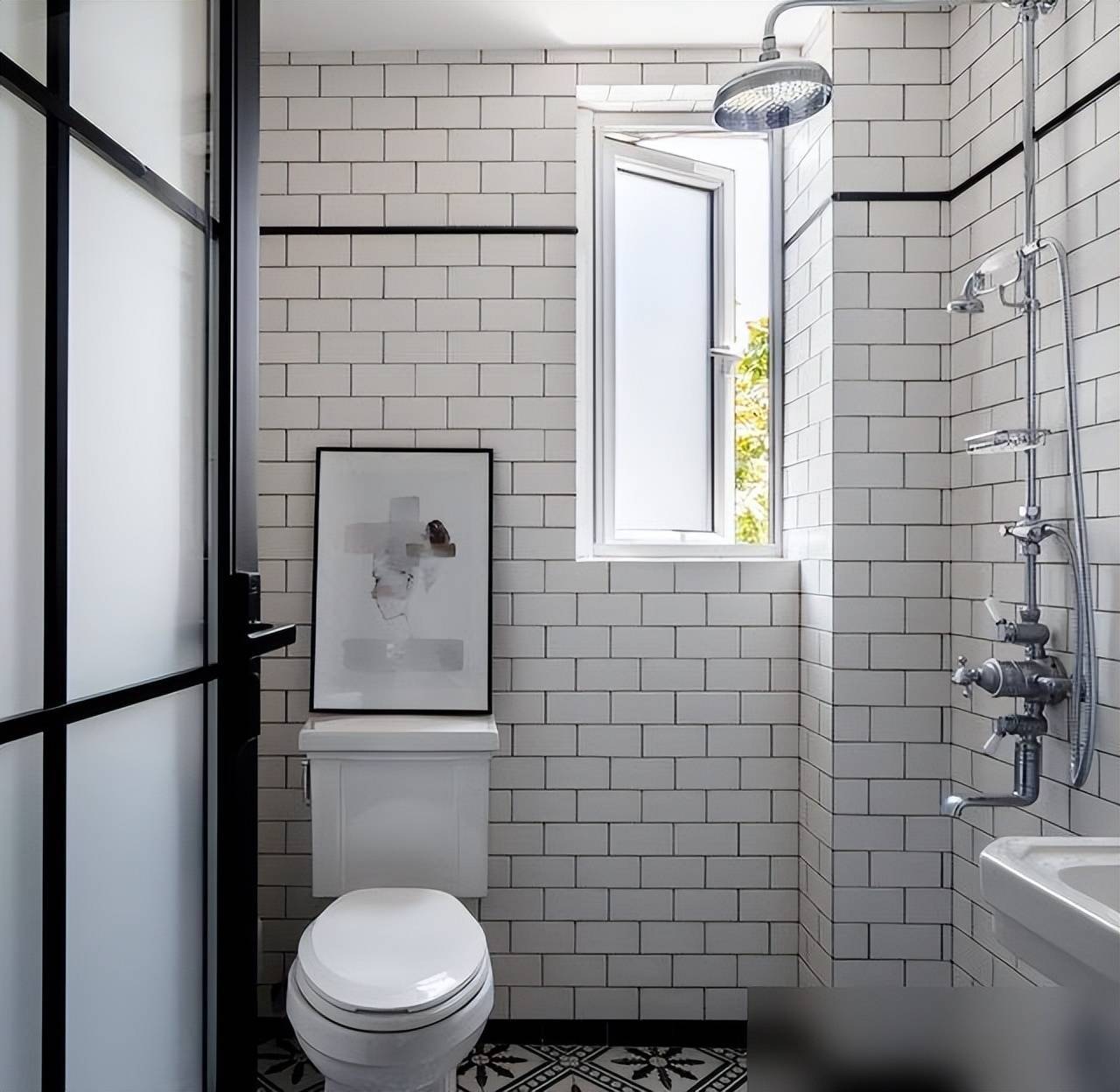 卫生间小得可怜,却用白色面包砖提亮,加一道黑色腰线,瞬间有了层次;浴帘比玻璃门好用一百倍!