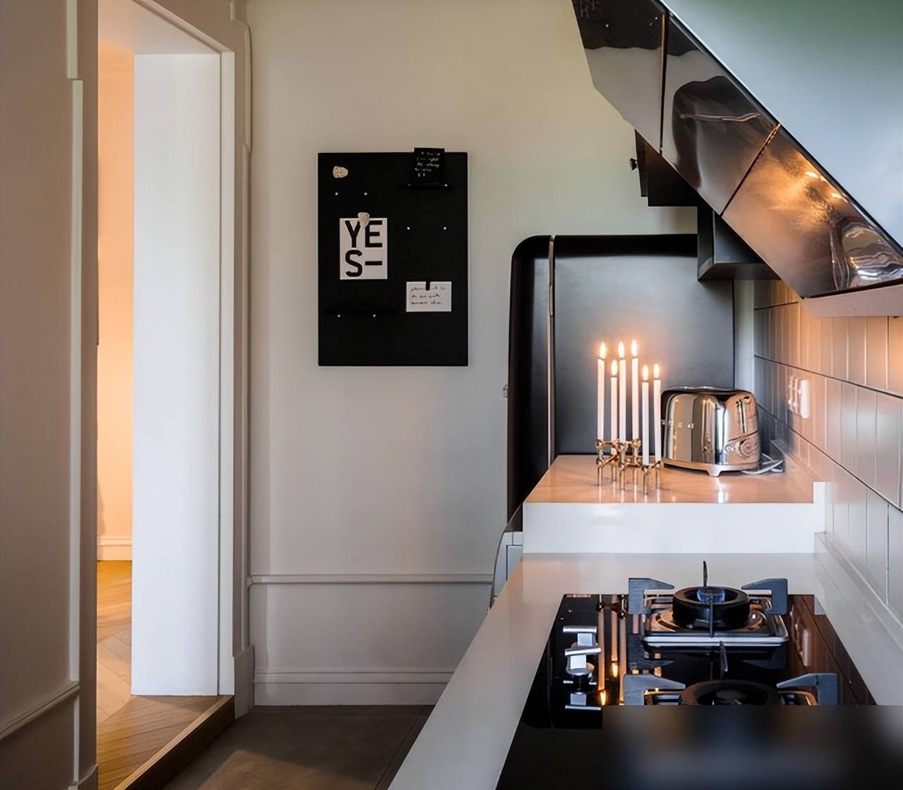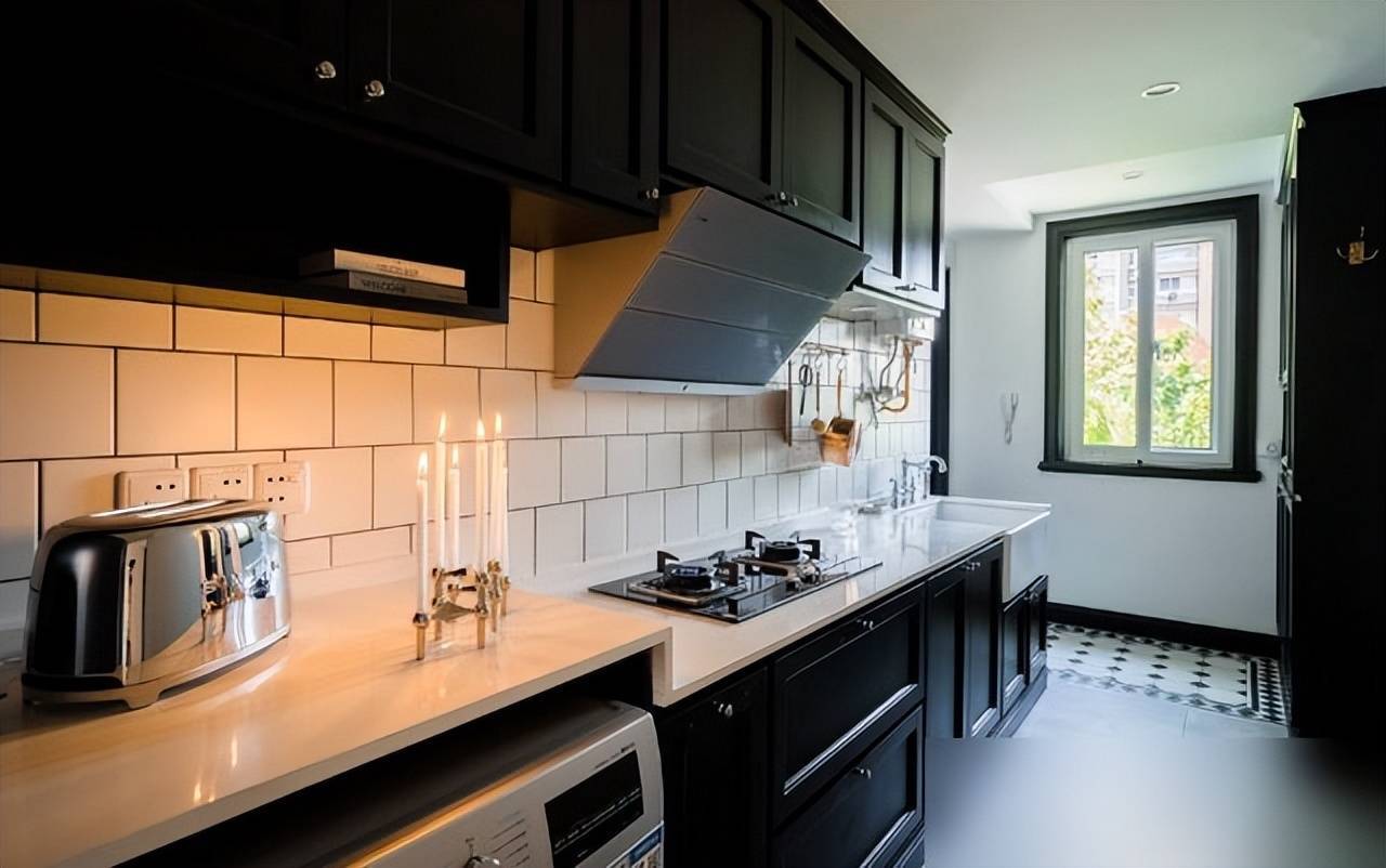 用拼花地砖把进门区和厨房分开,一开门先踩上花砖,不会直接撞进橱柜里;橱柜和鞋柜错位摆,避免了“一开门就顶到柜子”的压抑,高低台刚好嵌下洗衣机,小冰箱放远离灶台的位置——厨房就那么点大,每一寸都要算着用,不然转身都能碰到锅铲。