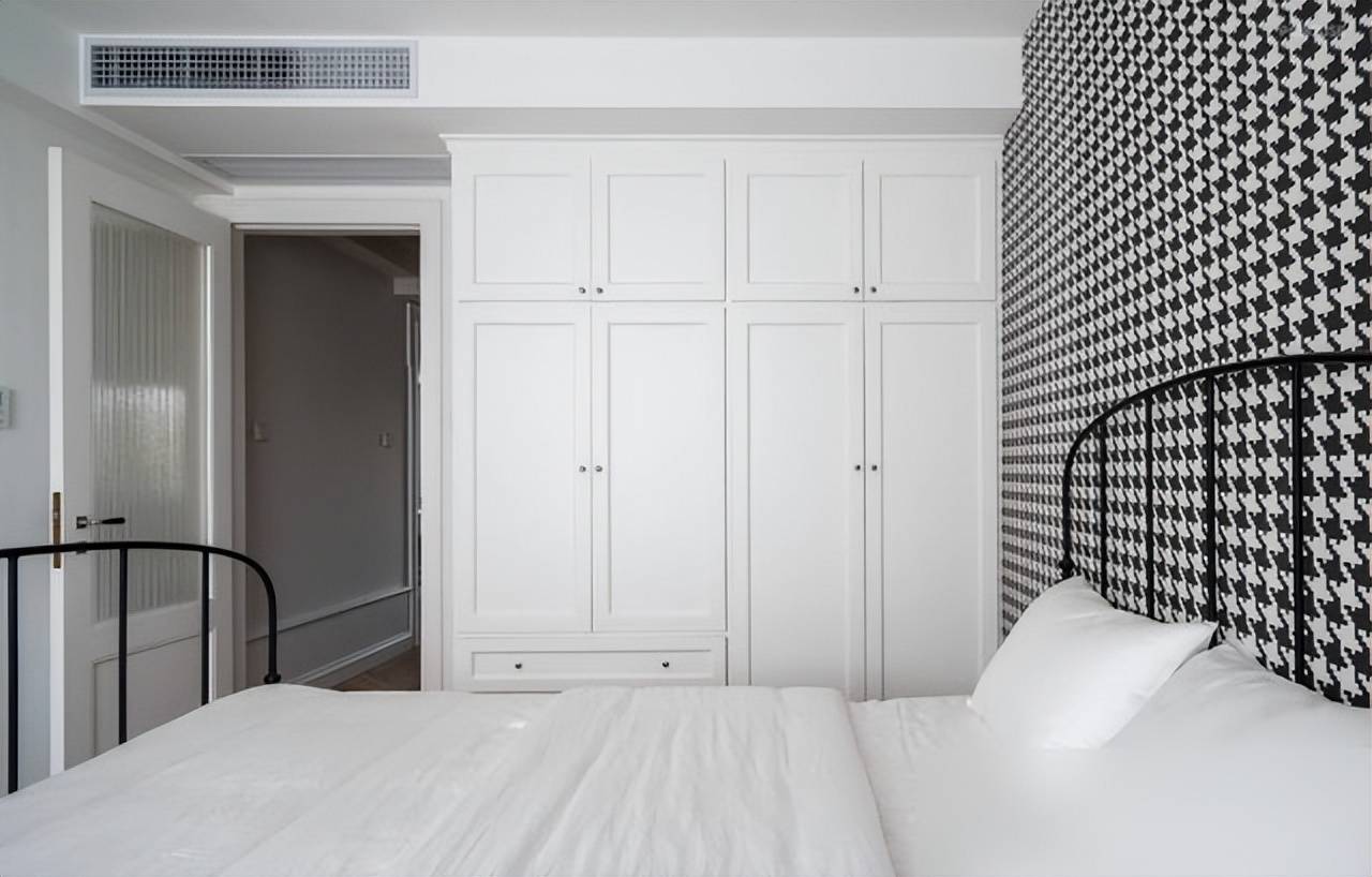卧室简直是“小空间的教科书”:局部吊顶把风管机藏起来,不会露着管子丑兮兮的;到顶衣柜能装下四季的衣服,双开门加个小圆把手,简洁得像没存在感,却能装很多东西;黑色铁艺床配马赛克墙纸,北欧风刚好,不夸张也不单调;最妙的是半玻璃门——关上门能 privacy,却能让客厅的光透进来,不会一进卧室就黑黢黢的,小空间的采光就得这样“串”起来!