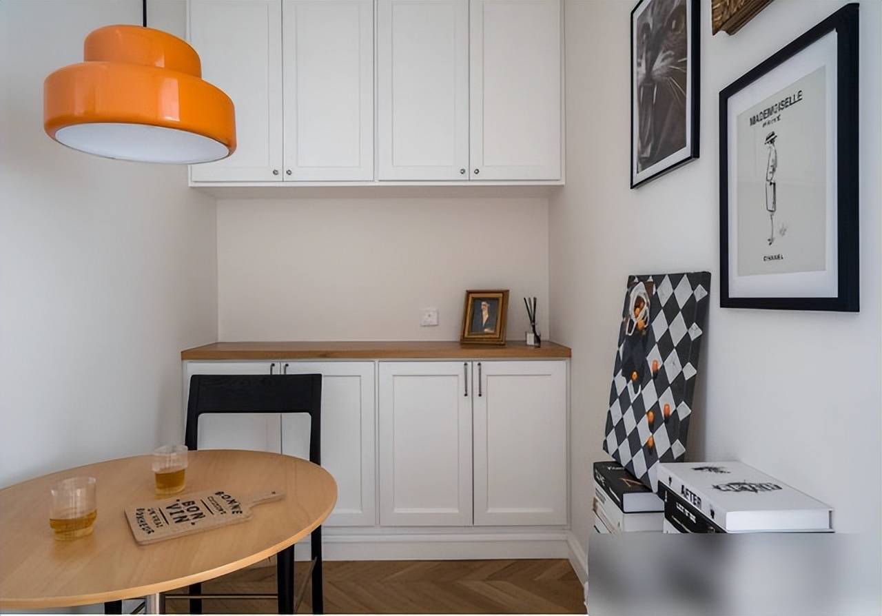 墙上挂幅画,桌上摆两堆书,再做个三层储物柜——既能装碗碟,又能放零食和小摆件,谁不想吃饭时旁边有本书可以翻?